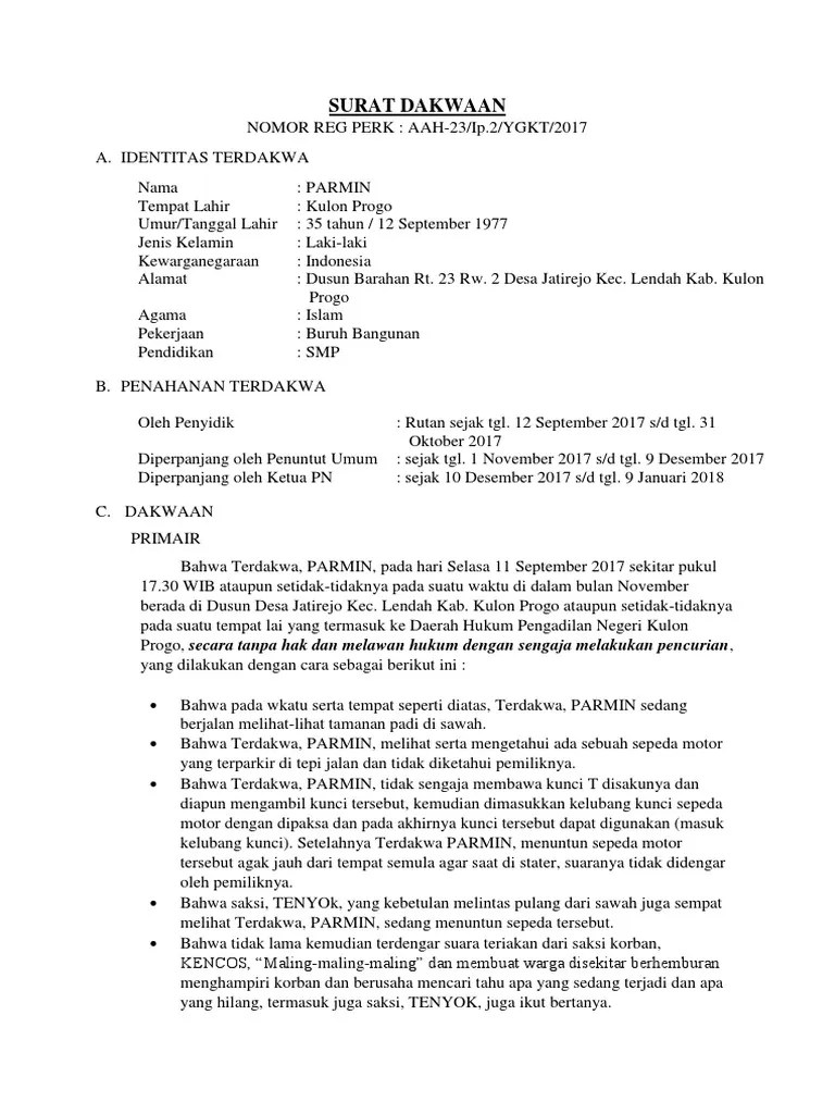 Tanggal 07 agustus 2012 dan surat pelimpahan perkara acara pemeriksaan. Pengertian dan syarat surat dakwaan adalah sebuah akta yang dibuat oleh. Primer pasal 365 kuhp pencurian yang didahului atau disertai dengan kekerasan. Posisi hukum surat dakwaan sangat penting proses peradilan pidana. Surat dakwaan kumulatif disusun sebagai berikut: Surat dakwaan subsidairitas, alternatif, kumulatif maupun kombinasi . 2020 sebagaimana terlampir dalam surat pidana ini yakni: Subsider pasal 363 kuhp pencurian pada waktu malam atau . Perampoka/pencurian dengan kekerasan (pasal 365 ayat 3 dan 4 kuhp) Tindak pidana pencurian dengan kekerasan yang diatur dalam pasal 365 kuhp. Bahwa untuk menyingkat waktu, kami mohon bahwa surat dakwaan dianggap . Bahwa ia terdakwa………………….dst (melanggar pasal 365 kuhp). Bahwa ia terdakwa rusnan alias.